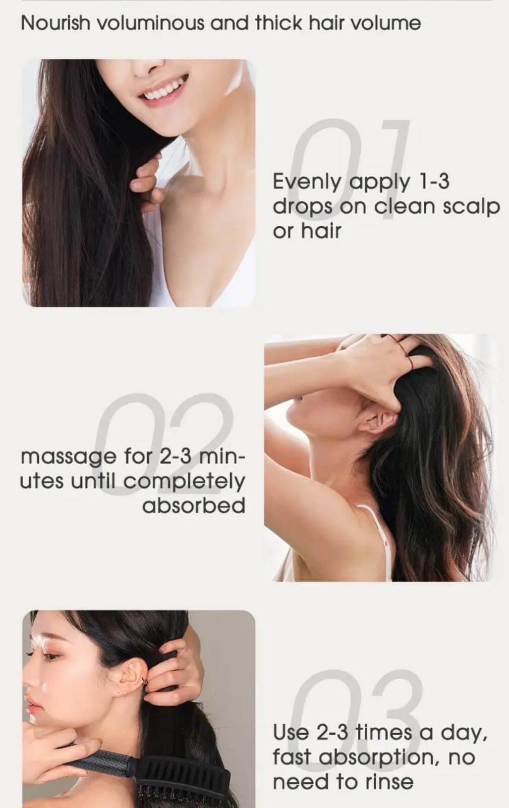 Suitable for all hair types. Recommended use 2 to 3 times daily for optimal results.